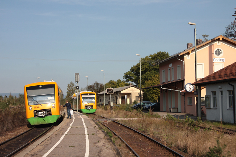 Kreuzung im Bf Roding mit den Oberpfalzbahntriebwagen VT32 als RB32227 (Schwandorf - Furth im Wald) und VT31 als RB32286 (Lam - Schwandorf) am 26.09.2009. Rüdiger Ulrich