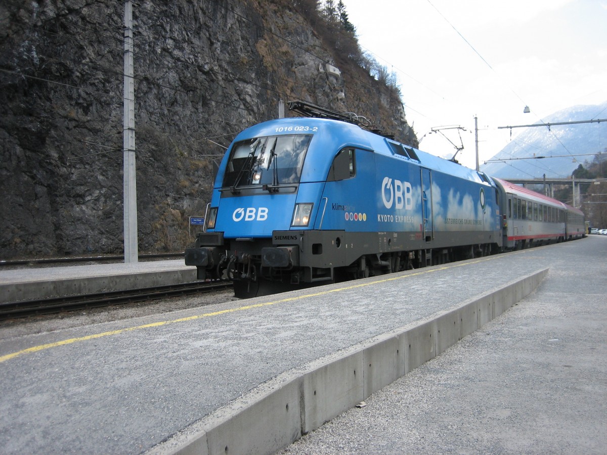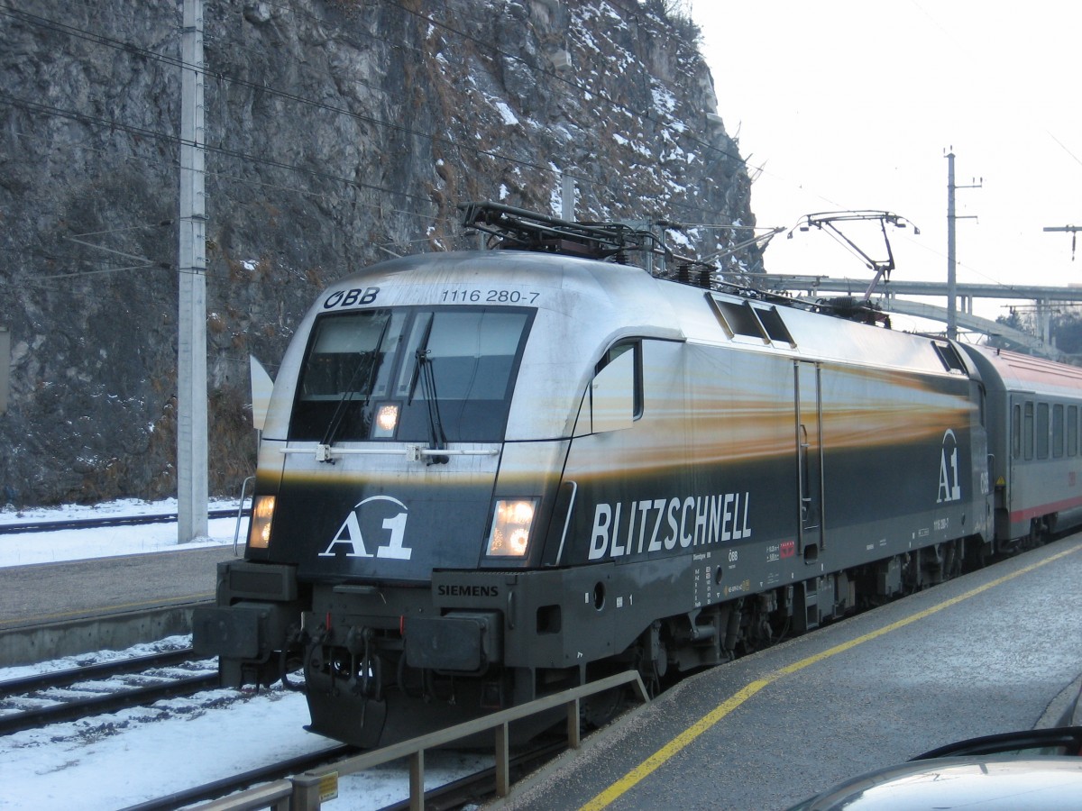 Historisches Bild aus dem Jahr 2009. 1116 280 im A1 Werbedesign vor dem EC 567 nach Wien Westbahnhof. Aufegnommen im Bahnhof Imst-Pitztal am 18.1.2009 Christoph Plank