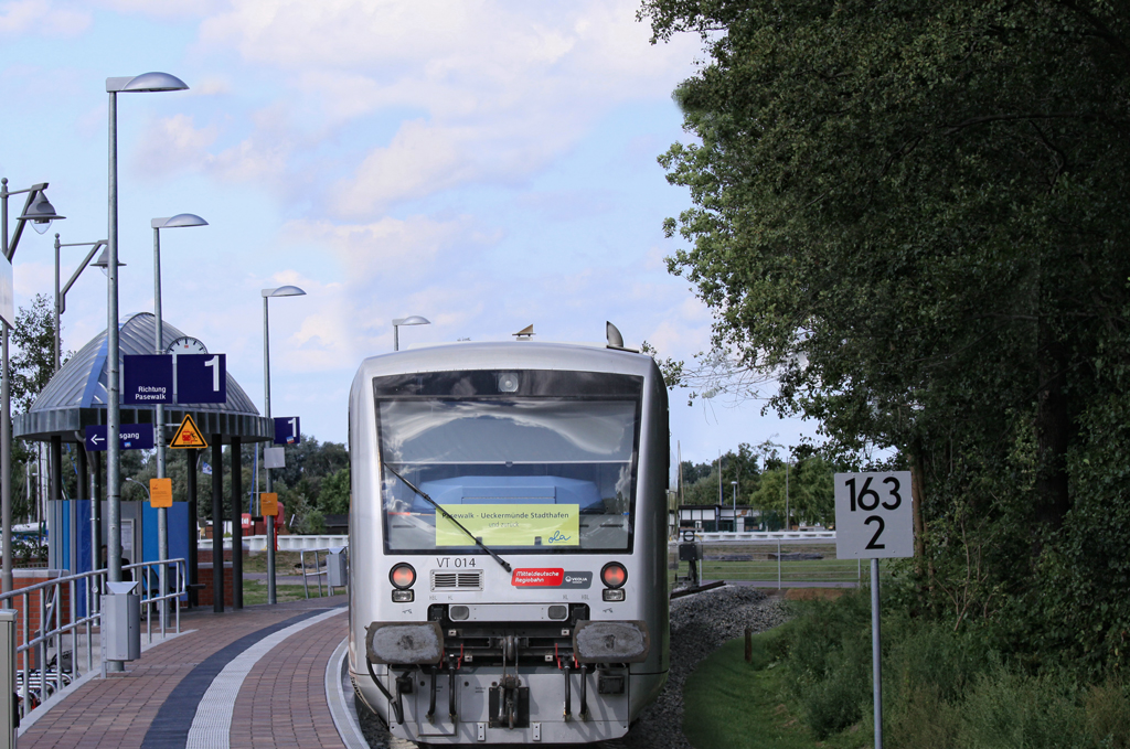 Auf der Strecke von Bützow (bzw. Güstrow), Pasewalk (Jatznick) bis zum Haltepunkt Ueckermünde Stadthafen, setzt die Ola planmäßig den Triebwagen vom Typ ,,Talent“ ein. Zeitweise jedoch, ersetzen (z.B. HU's) die Triebfahrzeuge vom Typ ,,Lint“ und ,,Desiro“ den ,,Talent“. Auch der Regio - Shuttle RS 1 konnte auf der Strecke abgelichtet werden. Dadurch waren Triebwagen verschiedenster EVU der Veolia-Gruppe zu Gast in Ueckermünde. 04.09.2009 Gerd Wiese