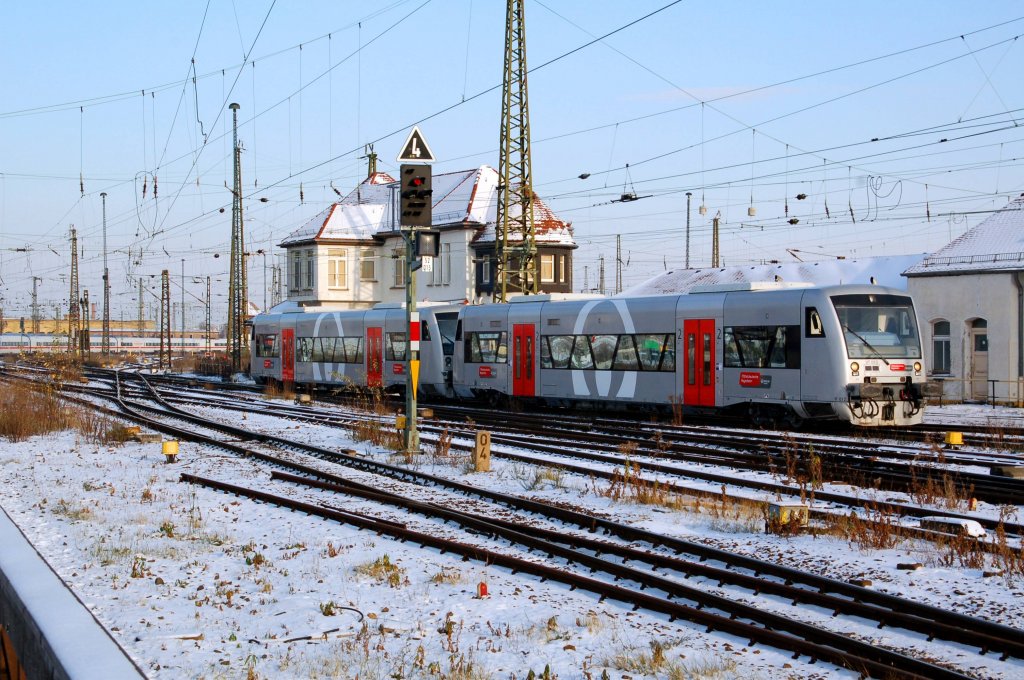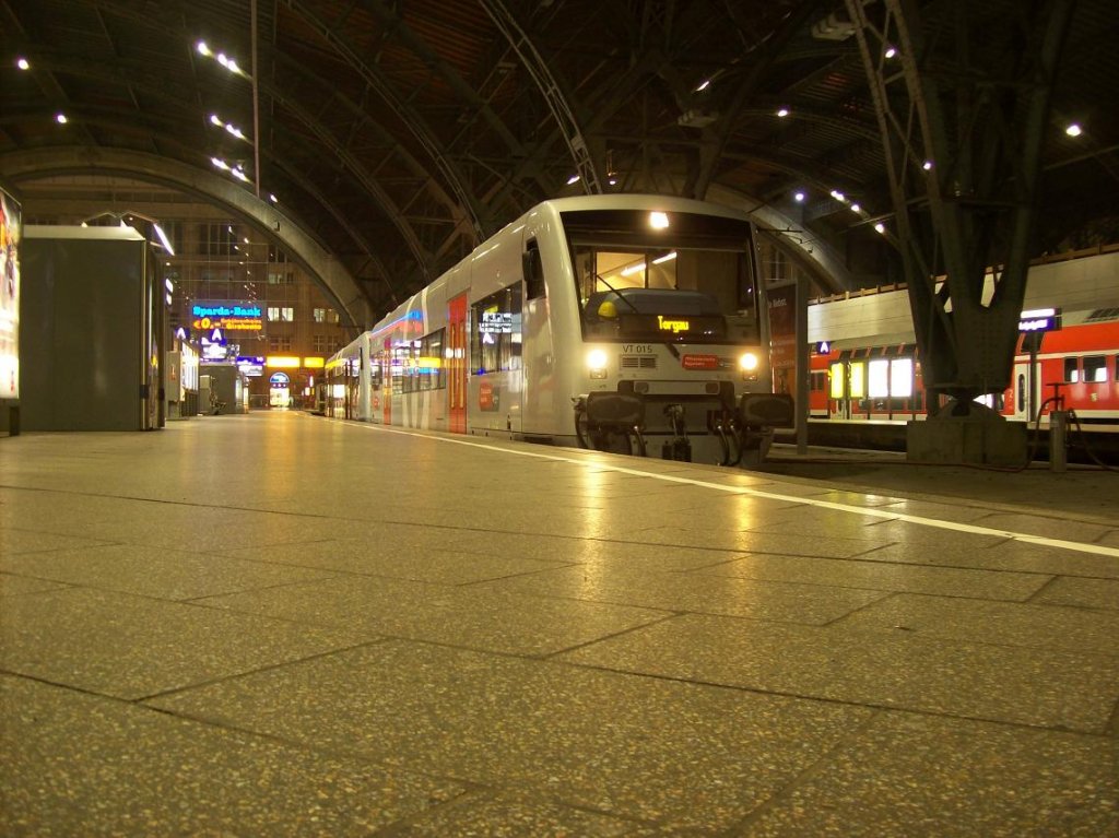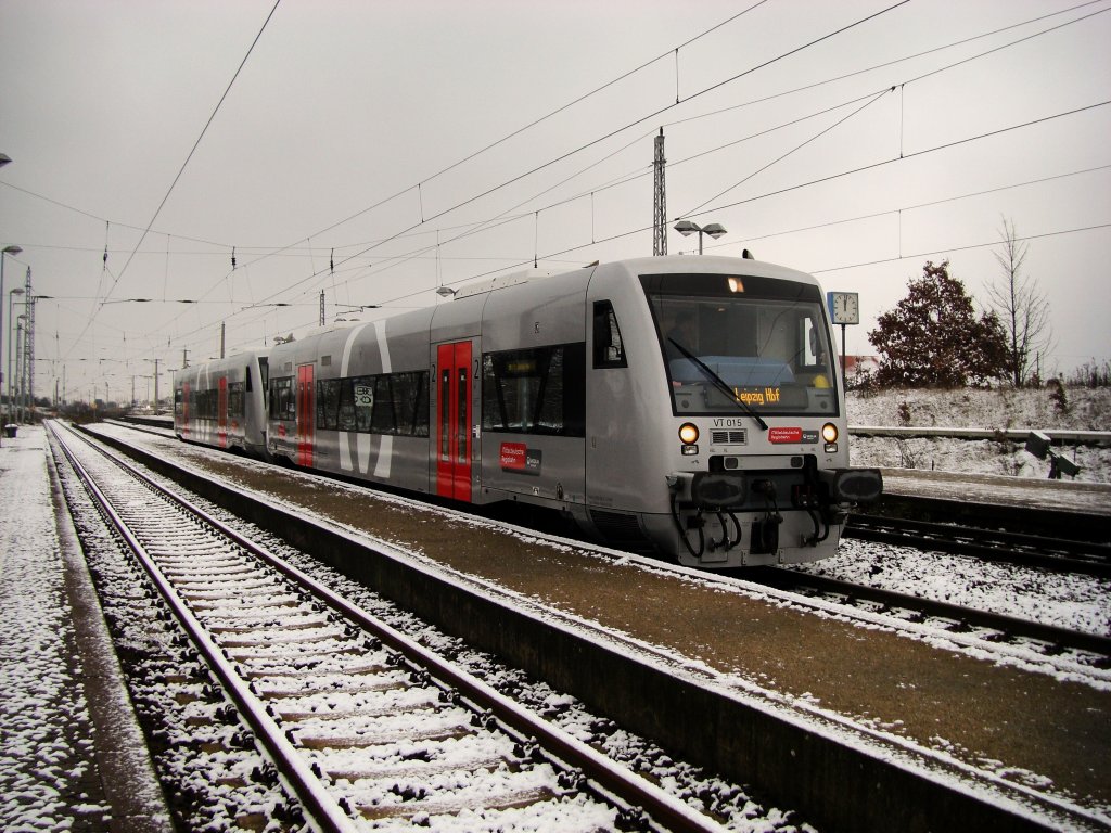 VT 015/004 der Mitteldeutschen Regiobahn am verlassenen wirkenden Bahnhof Eilenburg/Ost, wartet auf das Abfahrtsignal nach Leipzig/Hauptbahnhof, diese Strecke wird seit kurzem vom oben genannten Unternehmen bedient,13.12.2009 Lothar Kaiser