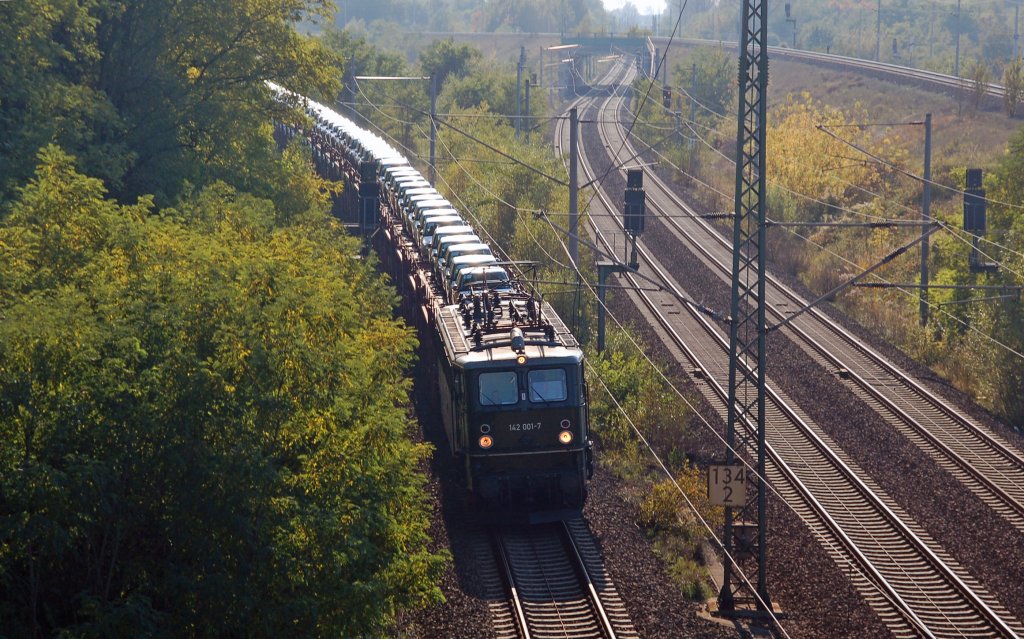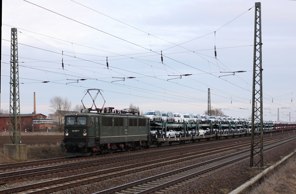 Lange nicht mehr gesehen. 142 001-7 der MTEG mit einem Ganzzug Autotransportwagen in Schönebeck-Frohse. Der Zug fährt in Richtung Magdeburg. Fotografiert am 19.03.2010. Christian Geschonneck
