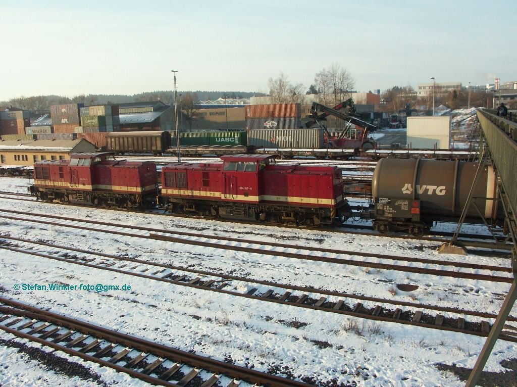 Am frühen Morgen des 10.03.2010 war in Hof Hbf einiges zu sehen. Wie am Vortag waren dabei die beiden 204 354 und 204 347 mit dem Ölzug. Hier die beiden Loks im DR-Lack vom Luftsteg aus. Leider macht mein Weitwinkel einiges krumm ....(obwohl ja rechts noch alles im Lot ist). Ober franke