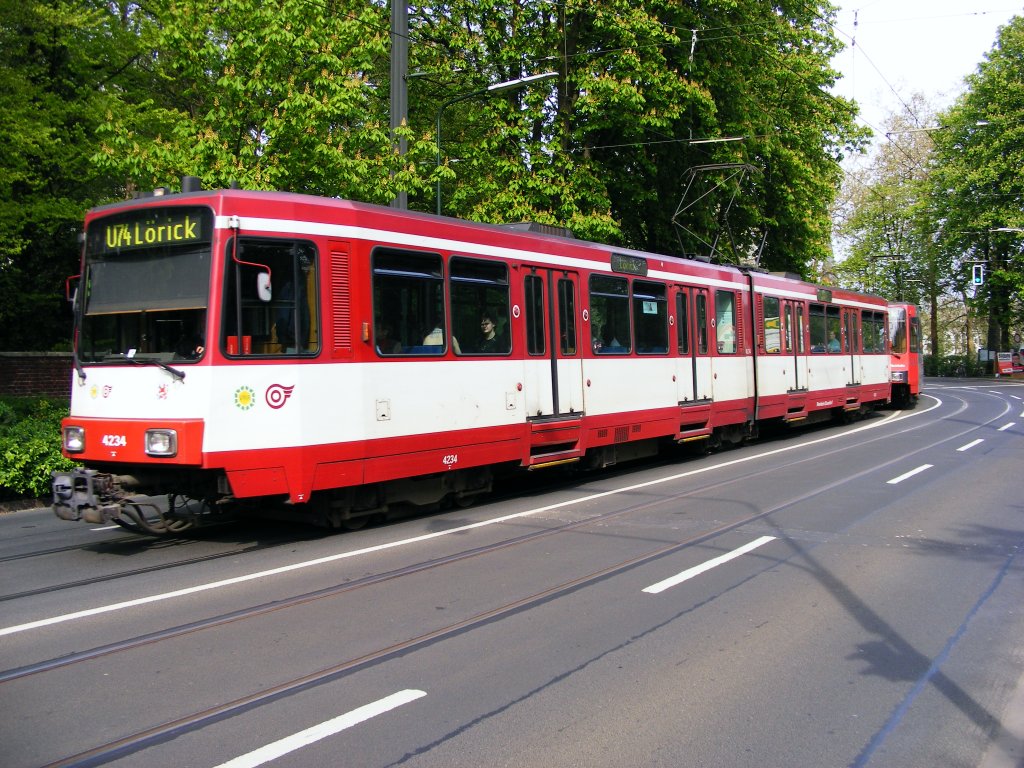 4208 und ein weiterer B-Wagen fahren als Linie U74(Meerbusch Görgesheide-Benrath Btf) am 9.1.2010 in die erste Düsseldorfer Haltestelle Lörick ein. Philipp K