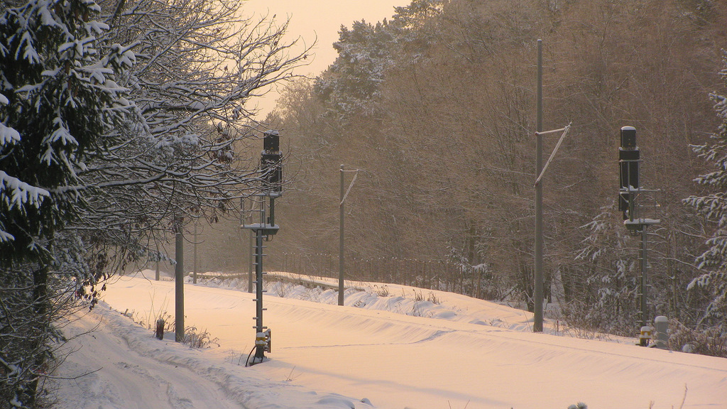 Der Blick in Richtung Bahnhof Bestensee zeigt, dass die Bauarbeiten erstmal auf Eis liegen. Die Planierraupe hat bis zu ihrem Standpunkt bereits neuen Schotter ausgebreitet, aber dann war Schluss und so steht sie nun seit 3 Wochen im Schnee und wartet auf den Frühling. Der Umbau der Strecke in Bestensee, bringt erstmalig 2-Gleise über spannende Masten hierher. (19.12.2010) Alexander Wiemer