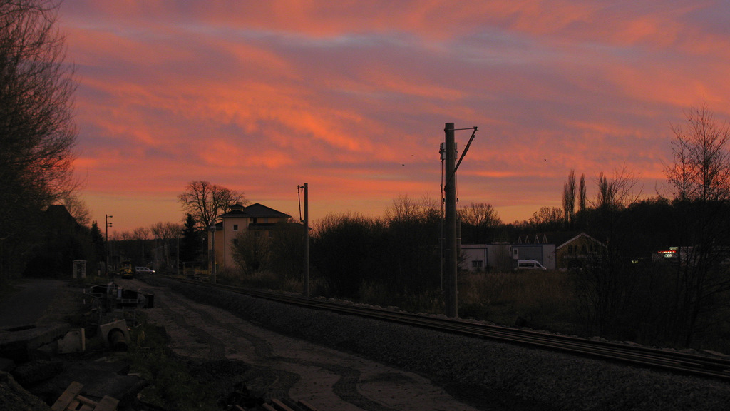 Ein Rückblick auf bauliche Tage zeigt dieses Bild. Aufgenommen am letzten warmen Tag des Jahres, dem 14.11.2010 (bis zu 15°C), zeigt es den Sonnenuntergang über der KBS 202 und dem Ort Bestensee. Alexander Wiemer