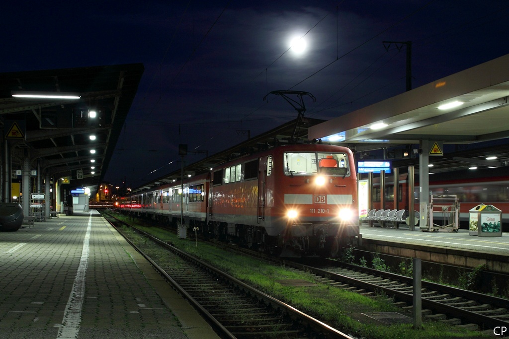 111 210-1 lässt sich am 24.8.2010 vom Vollmond bescheinen. Nach diesem Bild wurde unser ICE angekündigt und so musste die Fotoausrüstung doch etwas eilig zusammengesammelt werden. Christopher Pätz