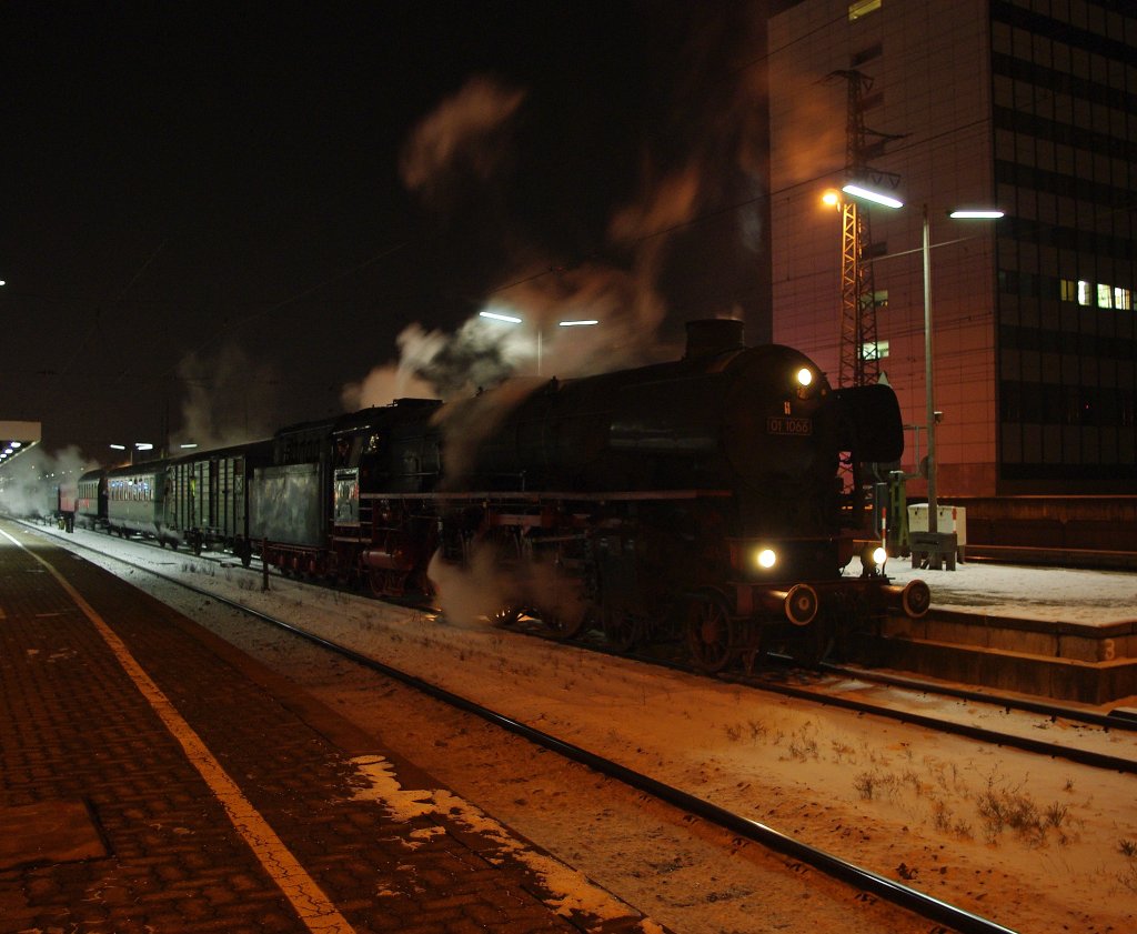 Das zweite Adventswochenende sorgte in Würzburg für einige Sonderfahrten. Auch wir haben uns den Weihnachtsmarkt dort mal angeschaut und am Abend noch 01 1066 bei der Abfahrt verabschiedet. Aufgenommen am 04.12.2010. Jens Baumhauer