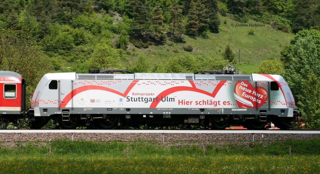 Ein Bild mit Seltenheitswert: 146 227-4 "Bahnprojekt Stuttgart-Ulm" am 23. Mai 2010 am Zugschluss des RE 19609 (Stuttgart Hbf - Singen (Hohentwiel)) bei Mühlen.