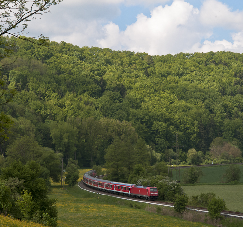 Da über das Pfingstwochenende auf der Gäubahn eine neue Brücke eingebaut wurde und somit die Strecke hinter Horb am Neckar gesperrt war, wurden die Regionalexpresszüge über die KBS 774 via Tübingen nach Stuttgart Hbf umgeleitet. Da die sg. Nagoldtalbahn jedoch nicht elektrifiziert ist, wurde eine 218 davorgespannt. Zusätzlich wurde mit n-Wagen gefahren, da die sonst üblichen Doppelstockwagen nicht durch den Sulzauer Tunnel auf der Strecke passen. Hier sieht man 218 495-0 + 146 226-6 als RE 19610 (Singen (Hohentwiel) - Stuttgart Hbf) bei Mühlen. Marvin