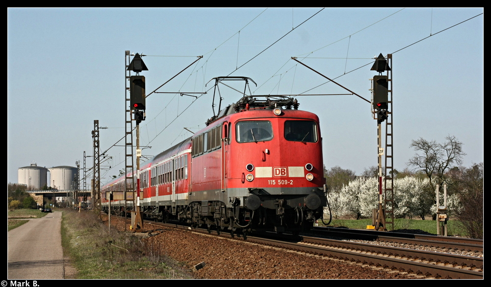 Am 06.04.10 half auch 115 509 von DB Autozug im Regionalverkehr aus. Vor nicht allzu langer Zeit half sie auch im Raum München bei DB Regio aus. Aufgenommen bei Wiesental. Mark B.