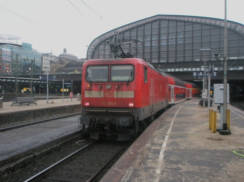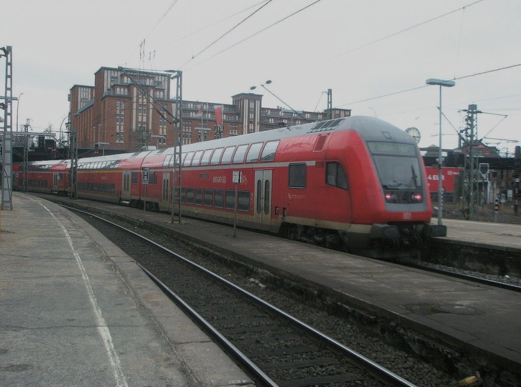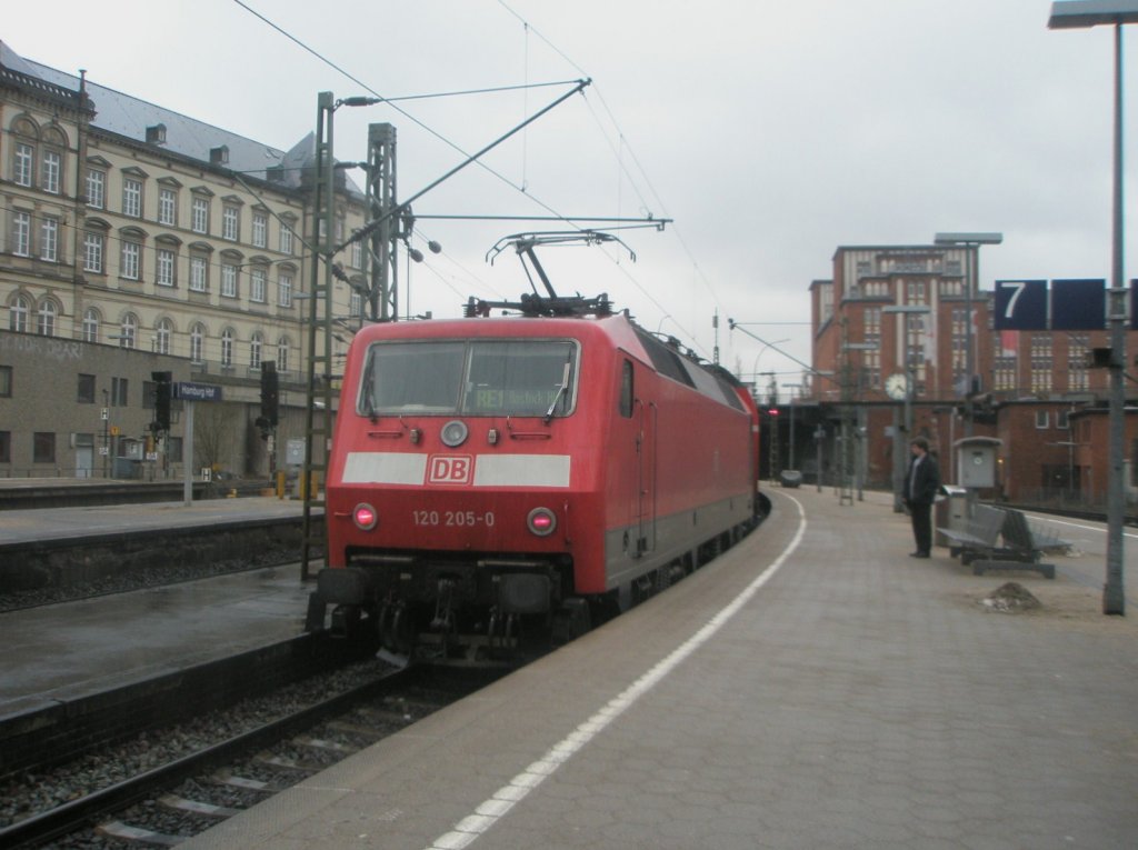 Lok an Lok stehen auf demselben Gleis gleichzeitig zwei Züge, um in entgegengesetzter Richtung abzufahren: vom Gleis 7a wird eine 143er einen RE nach Kiel schieben und vom Gleis 7 b wird 120 203 ihren RE nach Rostock schieben; Hamburg Hbf., 24.04.2010