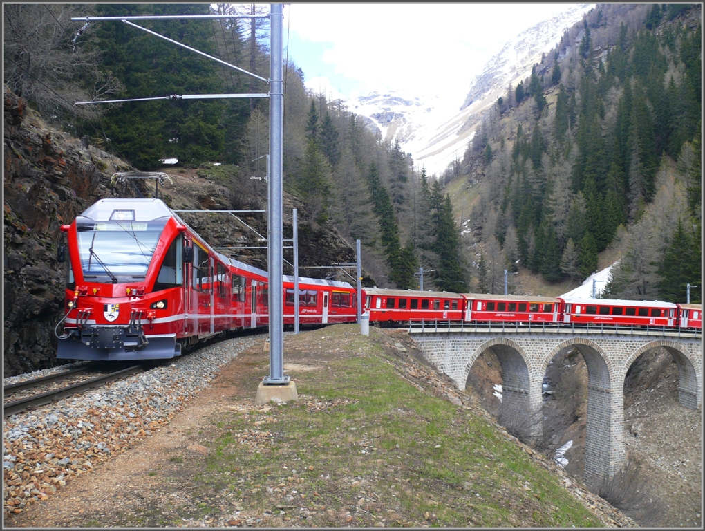 Das Ziel meiner heutigen Tour, die Brücke im Val da Pila oberhalb von Cavaglia. Trotz zum Teil knietiefem Schnee im Tobel und einer ständigen "Fotowolke", hat sich der Ausflug gelohnt. Die Allegra Triebzüge sind im Einsatz und hier kommt soeben BerninaExpress 961 über die renovierte Brücke des Val da Pila herunter. (20.05.2010) Herbert Graf