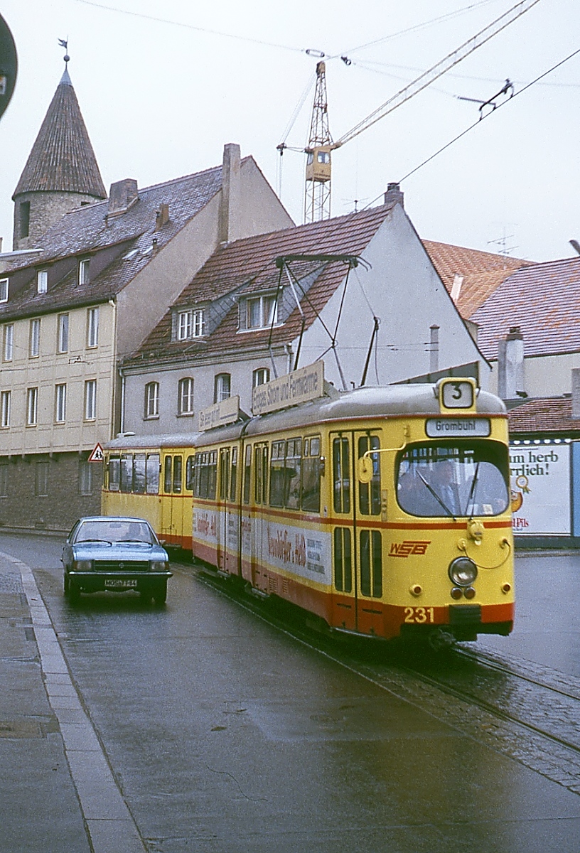 Mit einem zweiachsigen Beiwagen ist der Würzburger GTW-D6 231 im Frühjahr 1979 auf dem Weg zur Endhaltestelle in Grombühl unterwegs. Der 1967 als erster GTW-D6 in Dienst gestellte Triebwagen wurde 1982 zum Achtachser umgebaut und 2010 ausgemustert. Horst Lüdicke