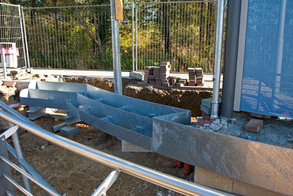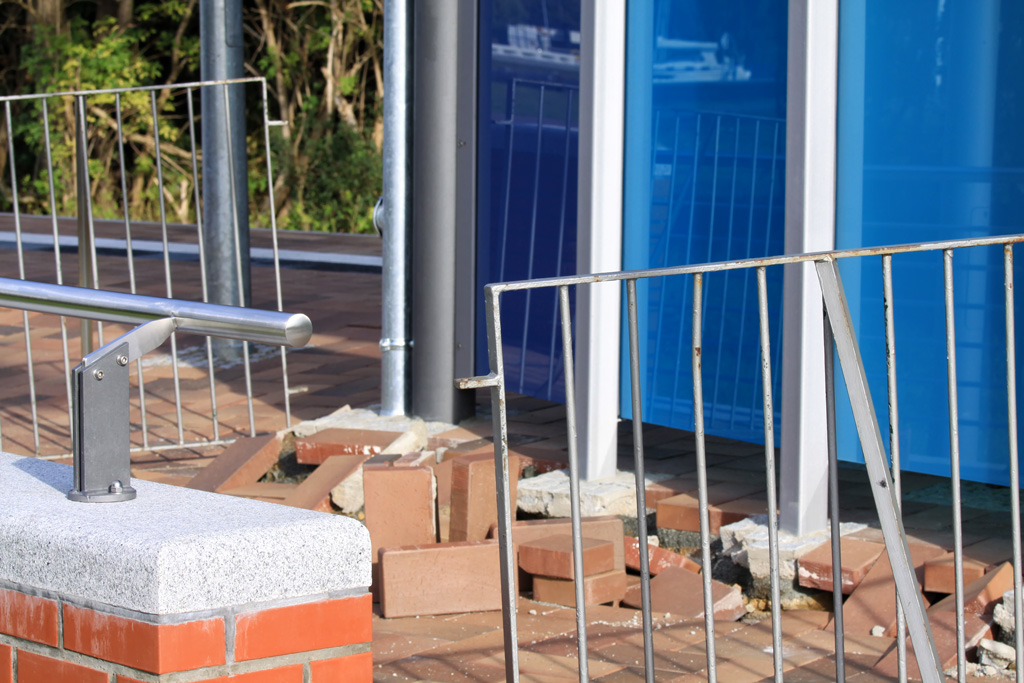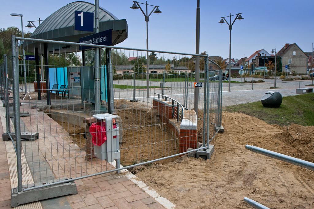 Am 02.03.2009 begannen die offiziellen Bauarbeiten der DB (bzw.deren Subunternehmen) an der Gleisverlängerung in Ueckermünde. Zu deren Verlauf gehören zwei neue Haltepunkte sowie zwei neue Bahnübergänge. Das Baugeschehen wurde am 15.08.2009 abgeschlossen. Jedoch begann nach kurzer Zeit der Zugangsbereich zum Bahnsteig abzusinken. Diese Nachbesserung dauerte bis Ende November 2010. Ab diesem Zeitpunkt wurden Bahnreisende in Ueckermünde mit einem Schmuckstück begrüsst. - Absinkender Zugangsbereich zum Bahnsteig Ueckermünde Stadthafen - 09.10.2009 Gerd Wiese
