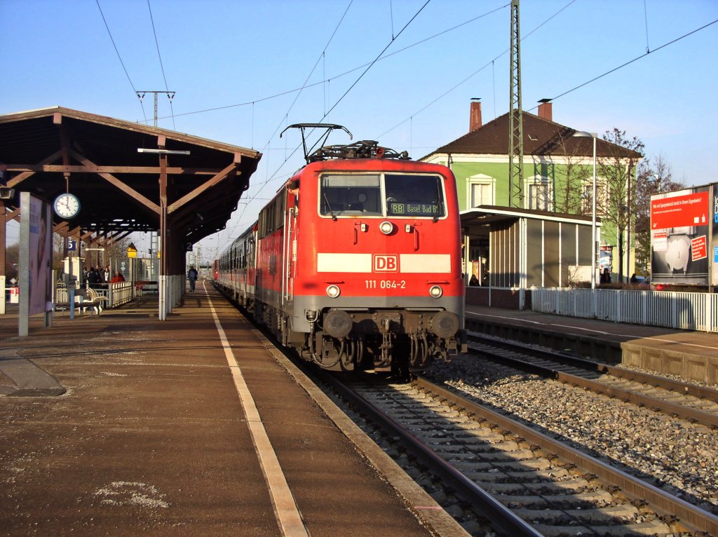 111 064-2 noch mit alter Lackierung am frühen Abend des 04.03.10 mit einer RB nach Basel Bad. Bf bei der Ausfahrt in Müllheim (Baden). Maximilian Grieger