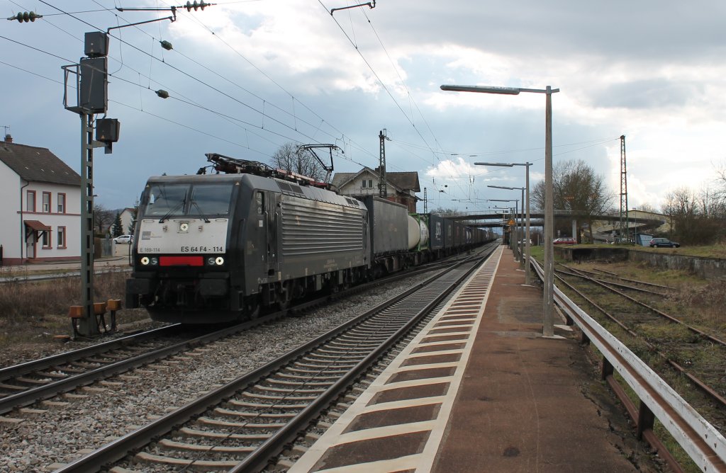 Hier die 2010 gebaute MRCE ES 64 F4-114 von der Holländischen Firma HTRS Nederland B.V. mit Sitz in Rotterdam. Hier ist die Lok kurz vor einer SIFA Zwangsbremsung bei der Durchfahrt des kleinen Bahnhofes von Orschweier. Tobias Schmidt