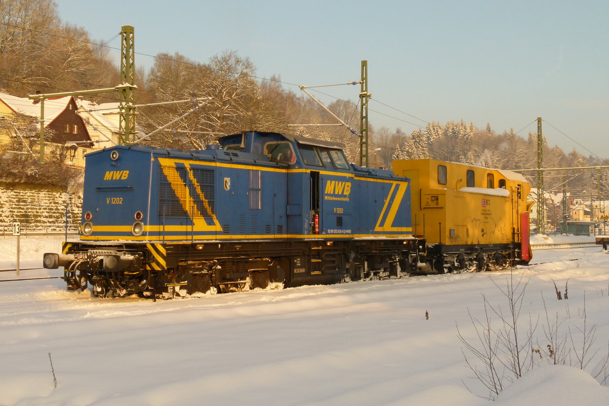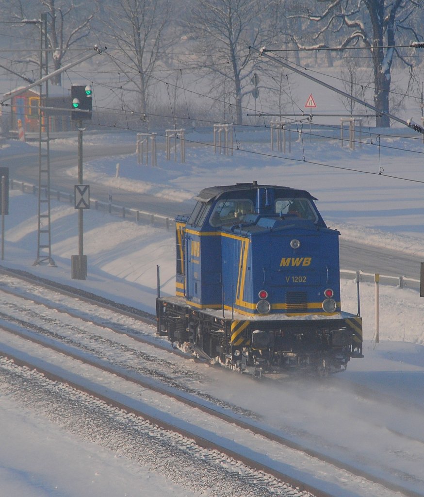 28. Dezember 2010, Kronach: In den letzten Tagen kam der Lichtenfelser Schneepflug mit der V1202 der Mittelweserbahn einige Male zum Einsatz. Heute wurde die Lok wieder abgezogen. Es ist die ex DR 112 630/ex DB 202 630 des Bw Neuruppin (LEW 1973). Jürgen Krause