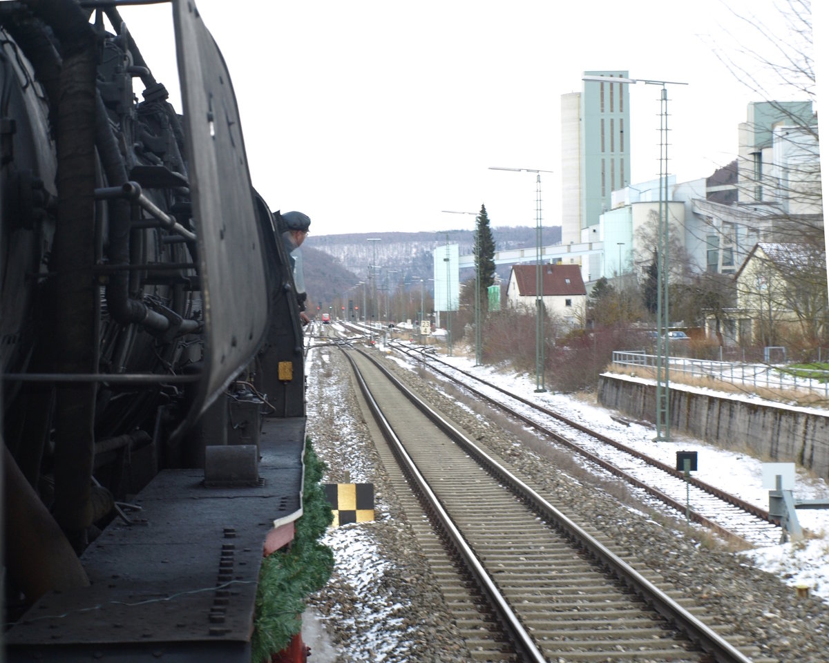 Blick über die Schulter des Lokführers von 50 3552-2 der Hanauer Museumseisenbahn, die hier als Zuglok des Nikolaus-Zuges der SAB an einem grauen Winternachmittag auf Einfahrt in den Bahnhof Schelklingen wartet. Diese wird frei gegeben, sobald der IRE Neustadt-Ulm Gleis 2 verlassen haben wird. Aufnahme 19.12.2011. Winfried Hanold