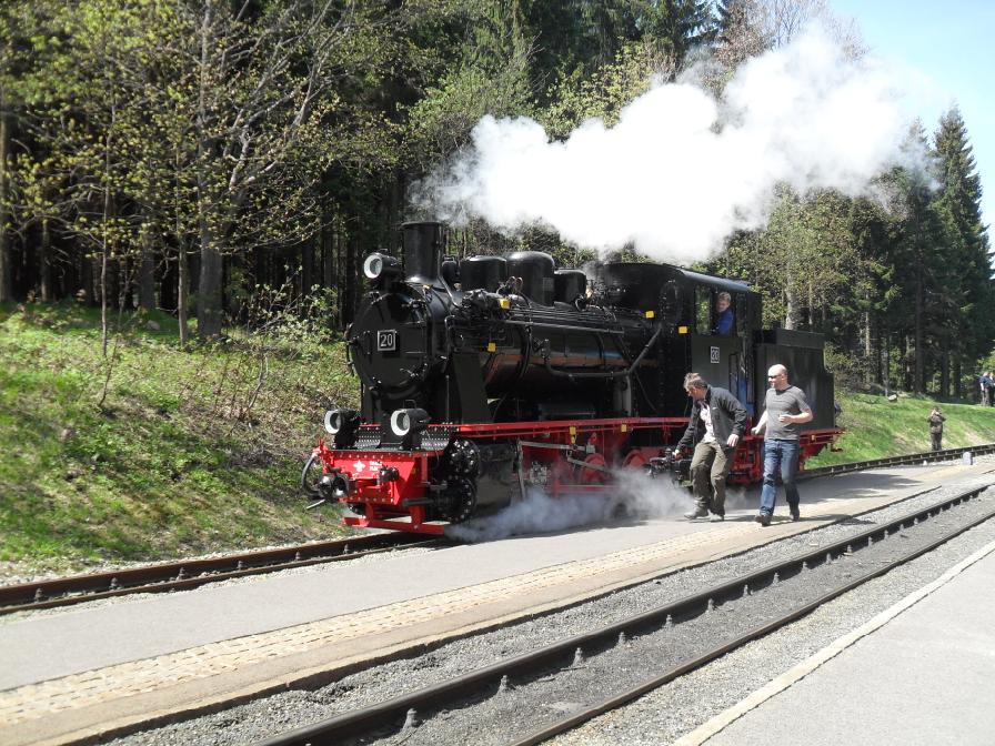 Roll-Outveranstaltung für die neue Lok 20. Im anschluss fand eine Sonderfahrt mit Lok 20 der Mansfelder Bergwerksbahn auf der Fichtelbergbahn statt. Hier wird unser Sonderzug von einem Regelzug in Niederschlag überholt. Auch hier wurde das Bild vom Inselbahnsteig aufgenommen. (06.05.2011) Mittelbach
