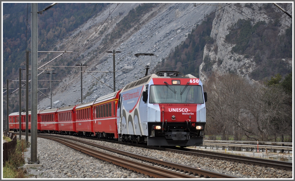 Wir treffen in Bergün ein mit RE1149, gezogen von der Ge 4/4 III 646 "Sta.Maria/Val Müstair". Die Eigenwerbung auf der Lok bezieht sich auf unseren Verkaufsschlager, das Bündner Generalabonnement für einen Monat oder ein Jahr. Interessant für Besucher der RhB, für Fr.215.- reist ihr einen ganzen Monat mit der RhB und Postauto durch ganz Graubünden. http://www.rhb.ch/fileadmin/user_upload/Reisen/Ueberblick_Broschueren/Buega_2011.pdf
