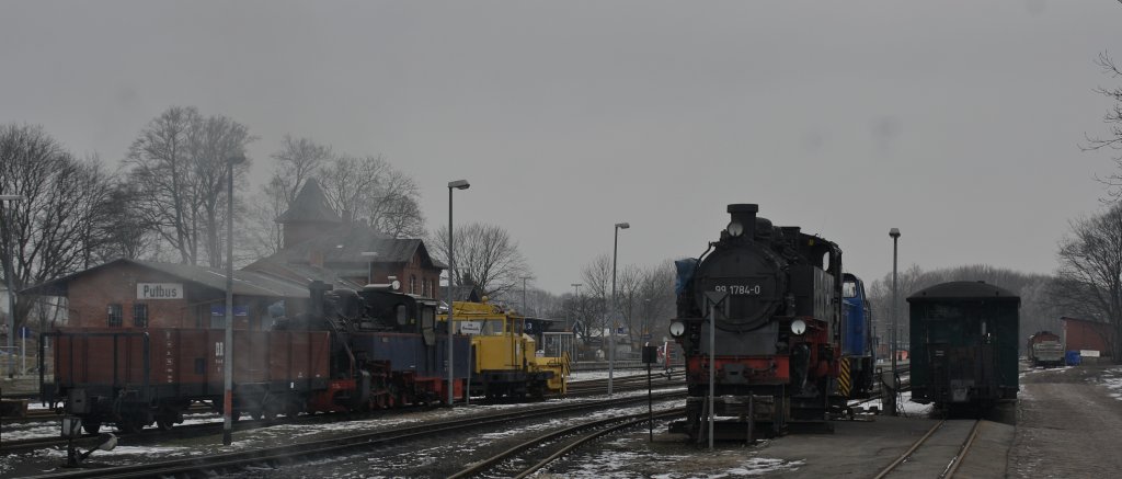 Nach dem die Dampflok am Lokschuppen in Putbus ihre Betriebsstoffe erhalten hat, ging es quer über den Bahnhof an die bereitstehenden Reisezugwagen am Bahnsteig 3. - 14.07.2011