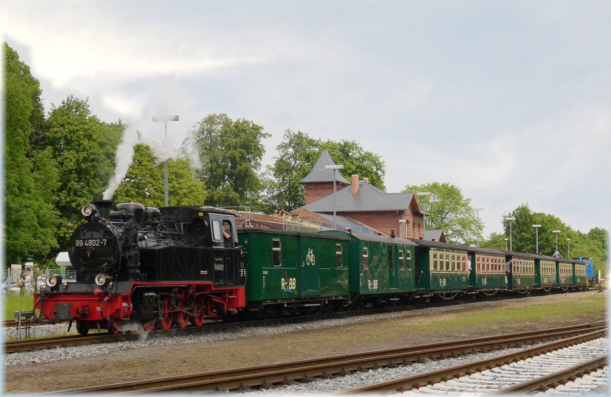 15. Juni 2011, Bahnhof Putbus: P102 von Göhren ist soeben angekommen. Er wird nach dem Ansetzen der Diesellok 251 901 am Zugende auf dem Dreischienengleis weiter nach Lauterbach-Mole fahren. Jürgen Krause