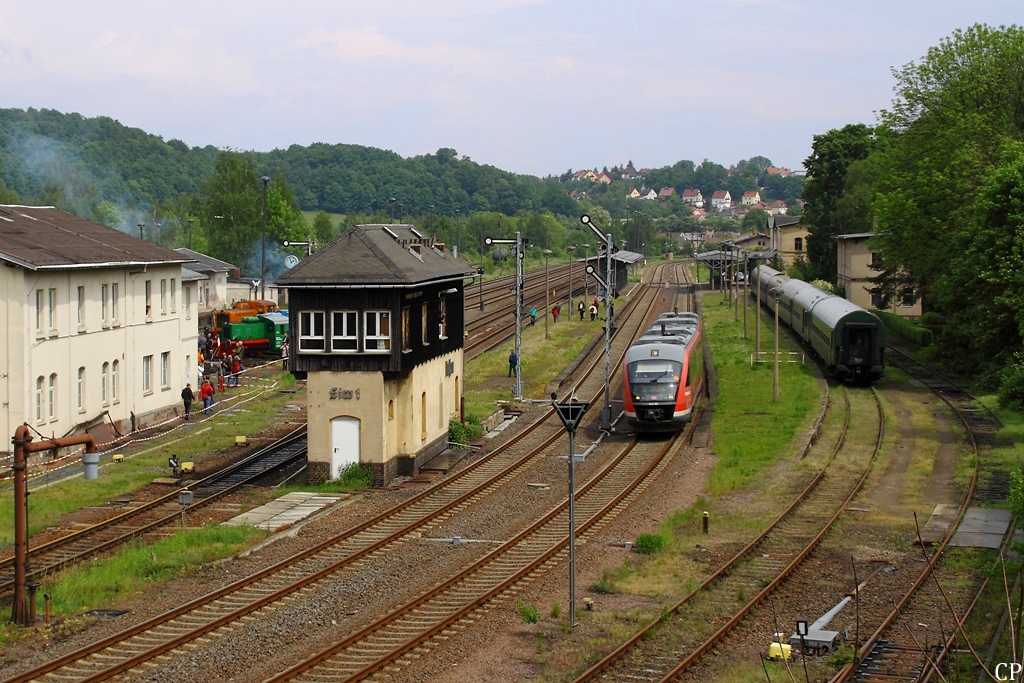 Zwei Desiro der DB Regio passieren am 22.04.2011 das Einfahrsignal des Bahnhofs Großsteinberg. Ziel des von 642 140/640 geführten Zuges ist Meißen. Christopher Pätz