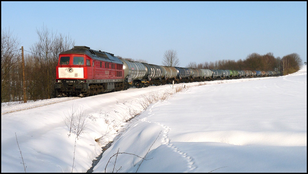 Am 05.01.2011 Kesselwagenzug mit 241 338 vom Tanklager Rhäsa in Richtung Nossen, Meissen, Coswig. Es ist der letzte schöne Wintertag vor dem grossen Tauwetter. Heinz-Ulrich Löwe