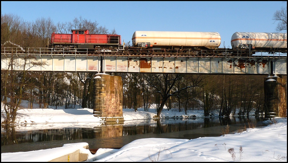 Am 04.03.2011 quält sich ein Ludmilla-Doppelgespann mit einem schweren Kesselzug aus Richtung Meißen weiter zum Tanklager Rhäsa. Hier wurde er gesehen am Block Miltitz-Roitzschen beim Halt, um den Gegenverkehr der Regionalbahn kreuzen zu lassen. Die Strecke vermittelt immer noch viel Flair alter Reichsbahnzeit. Das Foto wurde aufgenommen von einem noch offenen Bahnübergang. Heinz-Ulrich Löwe