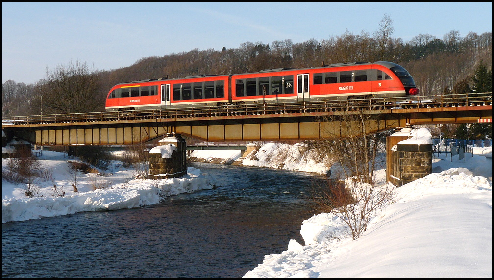 Die wahrscheinlich kürzeste S-Bahn-Linie der Welt verkehrt seit dem Fahrplanwechsel zwischen Meißen und Meißen-Triebischtal. Als Ersatz für die durchgehenden Züge der S-1, die nun in Meißen enden, verkehrt ein Pendelzug weiter nach Meißen-Triebischtal. Aufgrund des immensen Verkehrsaufkommens genüg dafür eine 143 und ein Steuerwagen. Am 23.2.2011 hatte 143 365-5 die Ehre, den Zug durch Meißen zu schieben. Grade hat der Zug den Bahnhof Meißen verlassen und die Elbe überquert. Christopher Pätz