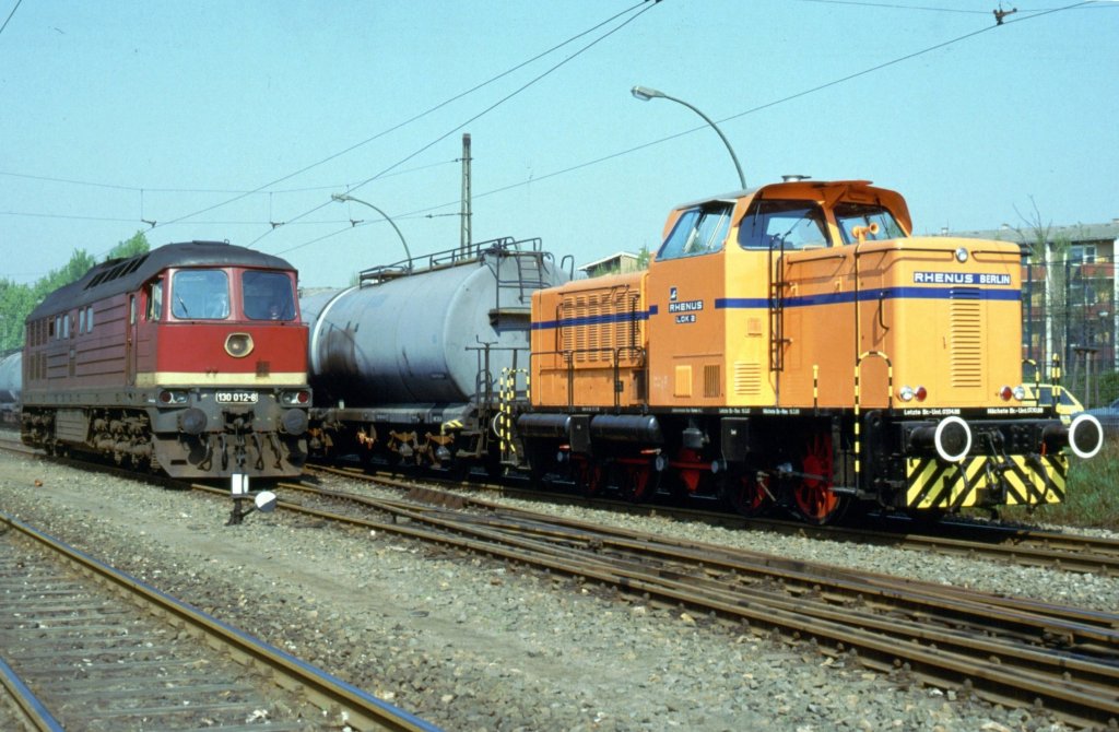 Rhenus Lok 2 Berlin-Haselhorst April 1988, daneben 130 012-8, die den Tankzug gebracht hat. Lok 2 wird den Zug gleich über die Hauptverkehrsstr. zum Tanklagen schieben. Gerd Bembnista