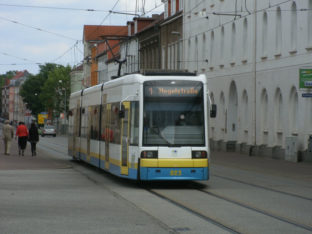 Schweriner Straßenbahntriebwagen 823,am 28.Mai 2011,an der Haltestelle Hauptbahnhof.