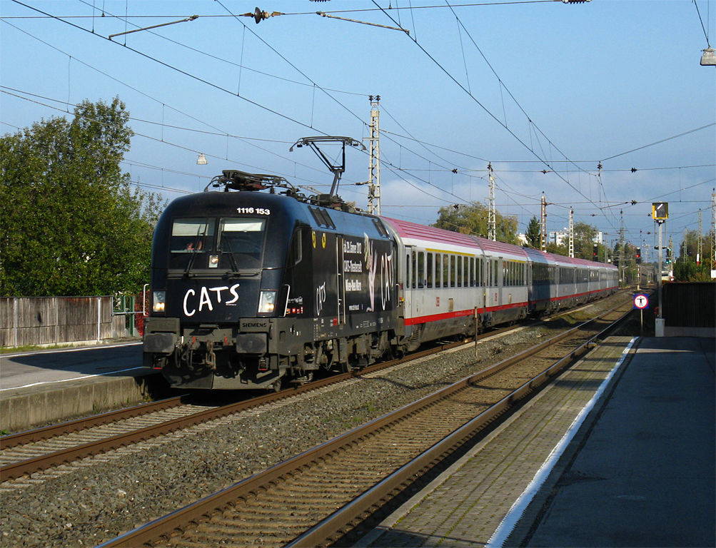 Auch eine sonnige Aufnahme mit der Katze ist mir endlich gelungen. Die 1116 153 "Cats" ist fast eine Woche später wieder auf dem ÖIC 867 zu sichten. Hier bei der Durchfahrt in Lauterach am 22.10.2011.