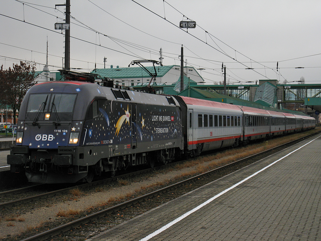 Leider bei schlechten Witterungsverhältnissen bekam die neueste Werbelok ( 1116 126 ) der Taurus-Flotte mit der Werbung für Licht ins Dunkel die Aufgabe den ÖIC 118 von Salzburg nach Lindau zu ziehen. In Lindau wird die Lok den Gegenzug wieder nach Innsbruck übernehmen. Fotografiert in Bregenz am 12.12.2011 S. Emir