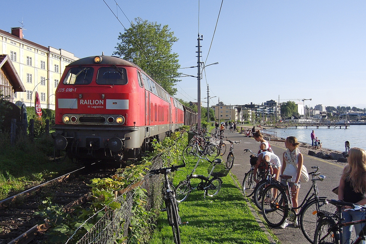 Diesellok- und Fahrradverkehr am Bregenzer Bodenseeufer. 225 018-1 und eine weitere unerkannt gebliebene 225er ziehen am 10.08.2011 zwischen Bregenz und Lindau einen auf Grund der Arlbergsperre umgeleiteten Güterzug, bestehend aus 3 Wagen, Richtung München. Jürgen Vos