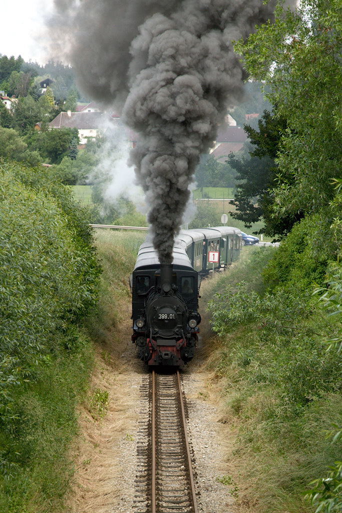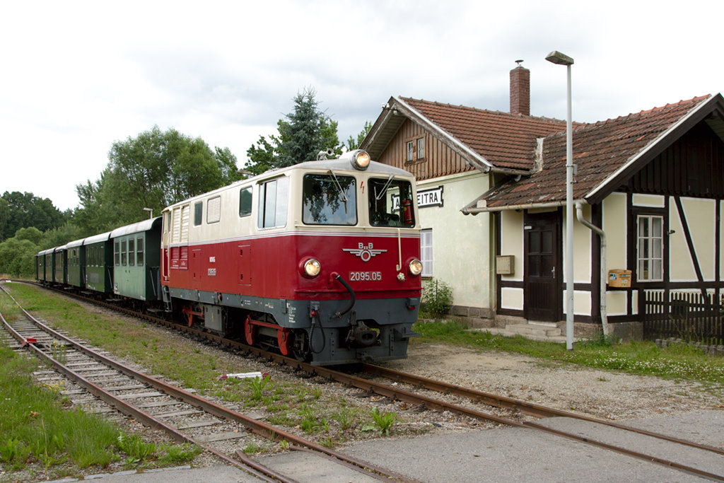Der kurze Zug von Littschau nach Groß Gerungs schickt sich gerade an, die Steigung hinauf nach Weitra zu erklimmen. (15.06.2011)