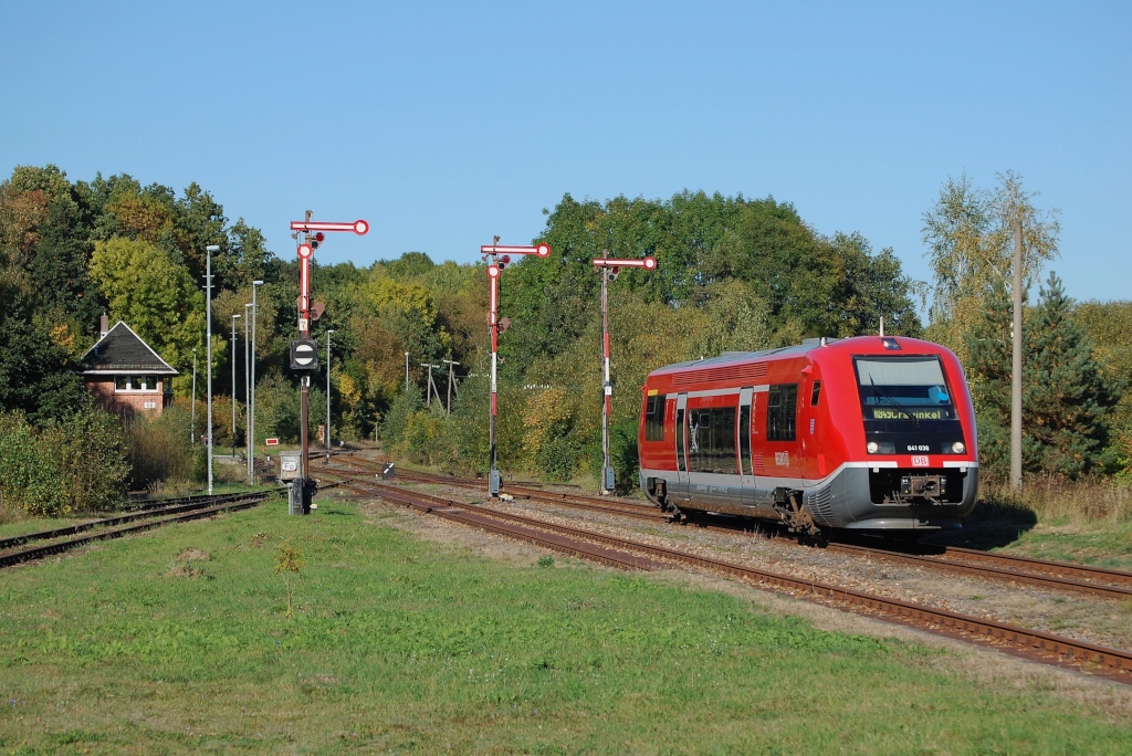 641 038 fährt am 01.10.2011 aus dem Haltepunkt Luisenthal heraus und überquert einen noch mit WSSB-Halbschranken gesicherten Bahnhübergang. Frederik Reuter