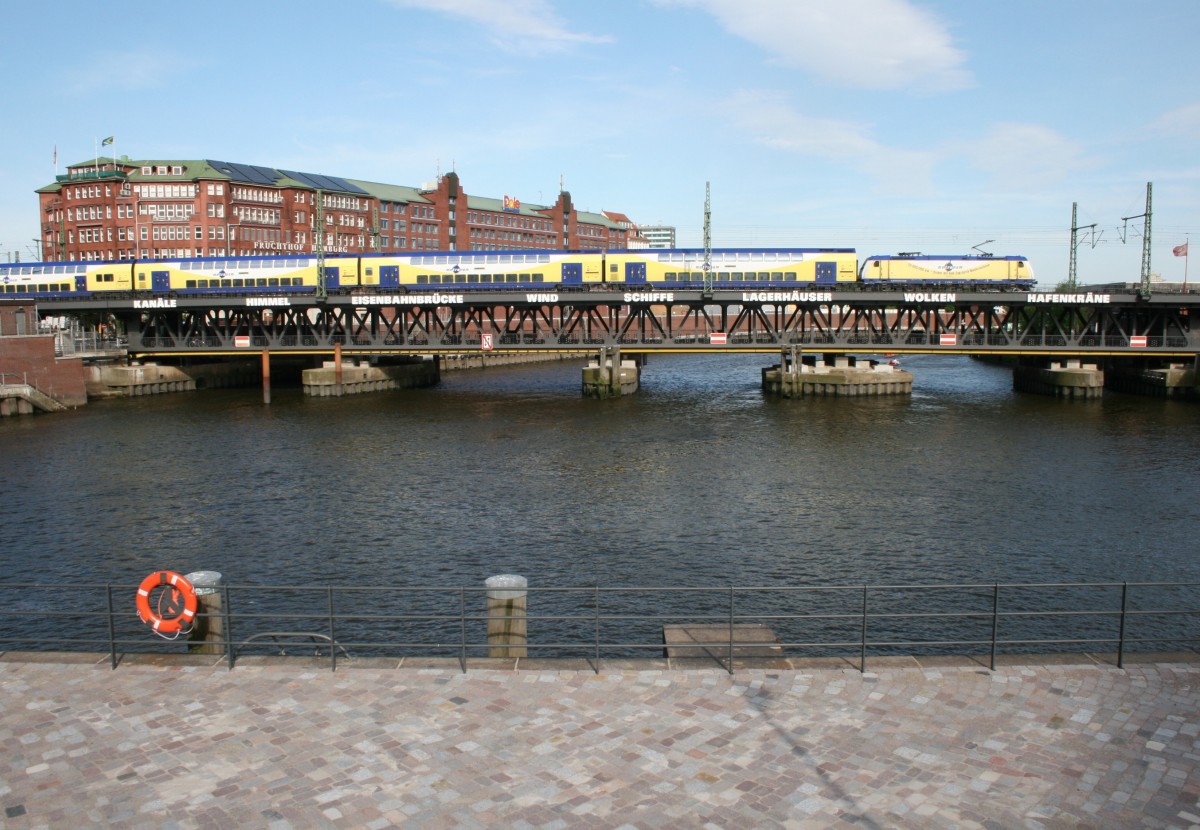 ME 146-18 ("50.000.000 km – Sicher mit dem Zug durch Niedersachsen") mit DLr 82745 (Tostedt–Hamburg Hbf) am 18.05.2012 auf der Oberhafenbrücke in Hamburg Gustav Richard