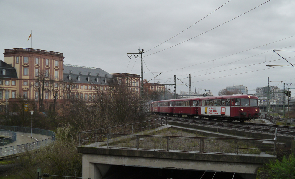 Der Schienenbus-Sonderzug mit 2 Motor- und 3 Beiwagen der Historischen Eisenbahn Mannheim (HEM) fährt am Mannheimer Schloss vorbei auf dem Weg nach Neustadt a.d.Weinstraße, wo die Fahrt mit dem Kuckucksbähnle weitergeht. (16.12.12) trainhero
