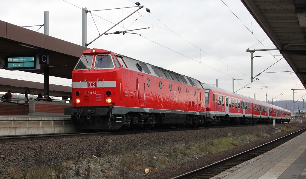 Am 03.12.2011 ging es von Göttingen aus auf den Weihnachtsmarkt nach Erfurt. Natürlich standesgemäß mit der Bahn. Und dann nicht mit irgendeinen Zug, sondern mit dem extra an den Adventswochenenden eingesetzten "Advents- Express", der jeweils Samstags und Sonntags einmal diese Strecke fährt. Meist bespannt mit 219 084-1- Hier kurz vor der Abfahrt in Göttingen. Jens Baumhauer