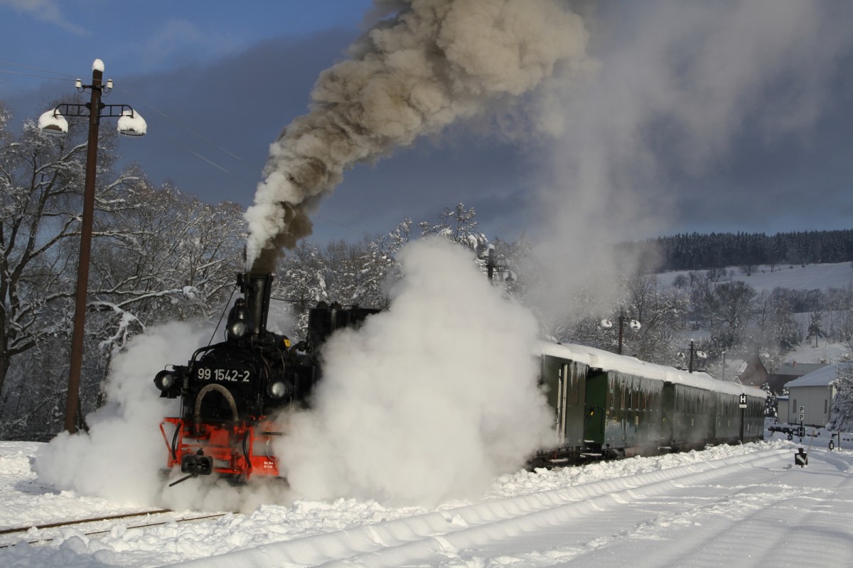 99 1542-2 auf der Fahrt von Steinbach nach Jöhstadt am 2.12.2012 in romantischer Winterlandschaft.