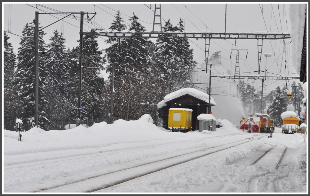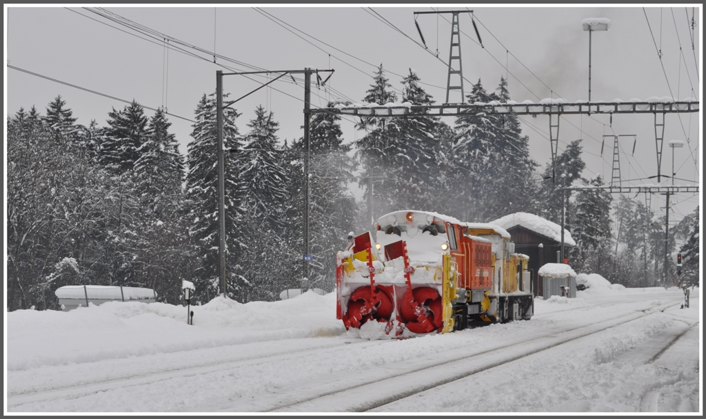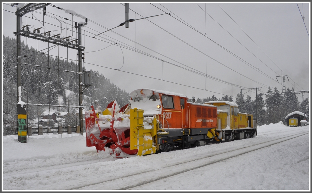 Zur Befreiung eines steckengebliebnen Regionalzuges zwischen Disentis und Sumvitg verkehrte gestern die Schleuder 9217 mit Gm 4/4 242 ins Oberland. Hier ist das Gespann bei der Einfahrt in Ilanz zu sehen. (21.01.2012) Herbert Graf