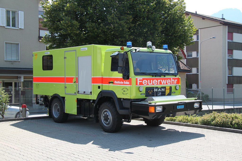 Zweiweg-Feuerwehrfahrzeug Xm 2/2 der RhB in Landquart.Das Fahrzeug kann ausser auf der Strasse,auch auf Schienen fahren.Davon besitzt die RhB z.Zt.zwei Tanklösch- und zwei Rettungsfahrzeuge.26.07.12 Peter Walter