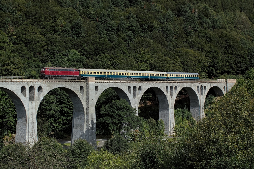 Kurz vor Willingen geht es über ein Viadukt. Anlässig 10 Jahre Kurhessenbahn fuhren die RBs alle mit historischen Zügen. Die 218 387 ist unter Eisenbahnfreunden umstritten, da sie in der Vergangenheit nie altrot war. Markus Ü.