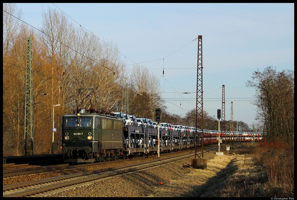 Holzroller 142 001 (ex E42) hat in Bad Schandau einen Autotransportzug (Skodas) aus Tschechien übernommen und kommt damit durch Dresden Hbf. - 01.06.2012