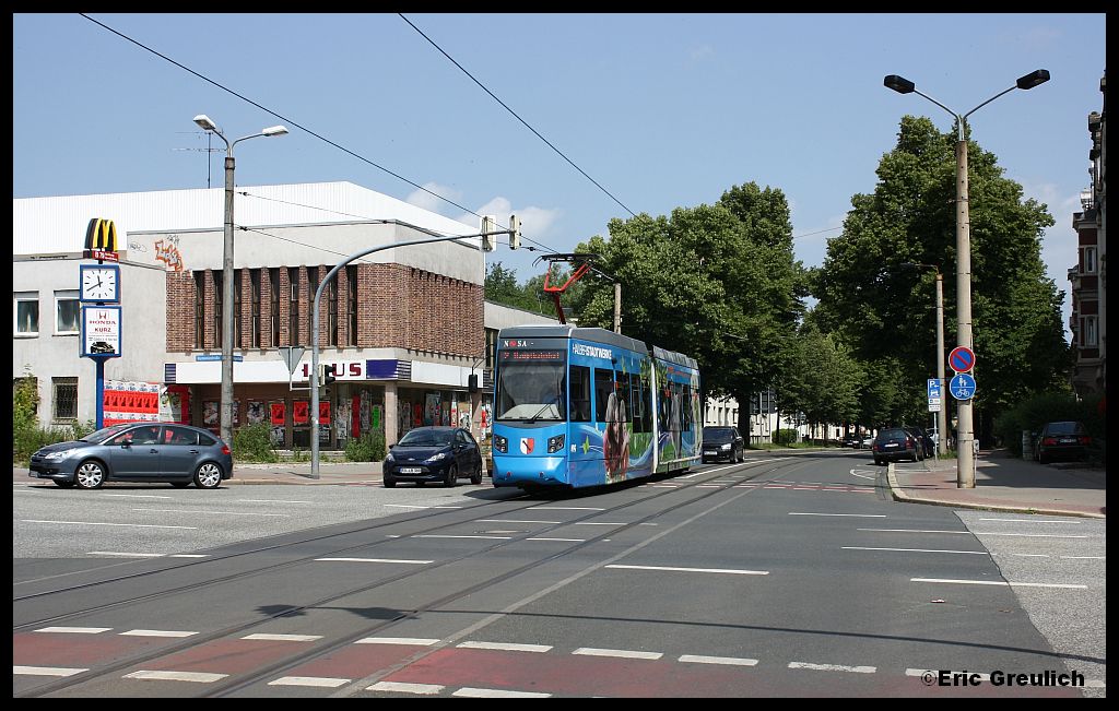 Wagen 5 der halberstädter Straßenbahn hat am 20.08.2012 gerade die Haltestelle Hauptbahnhof verlassen, um nun auf der Linie 2 in Richtung Herbingstraße zu fahren. Rick Eichner