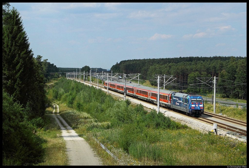 Die  Eco2phant -Lok 101 042-0 ist am 14.8.2012 mit dem RE 4017 nach München unterwegs. In Kürze erreicht der Zug Allersberg.