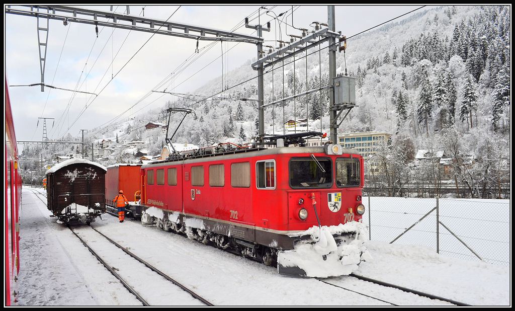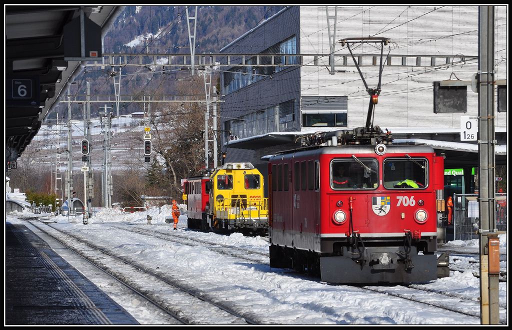 Ge 6/6 II 705 "Pontresina/Puntraschigna" mit einem Oelzugkreuzt den ABe 8/12 in Zizers. Links auf den SBB-Geleisen nähert sich der IC 565. (20.11.2012) Herbert Graf