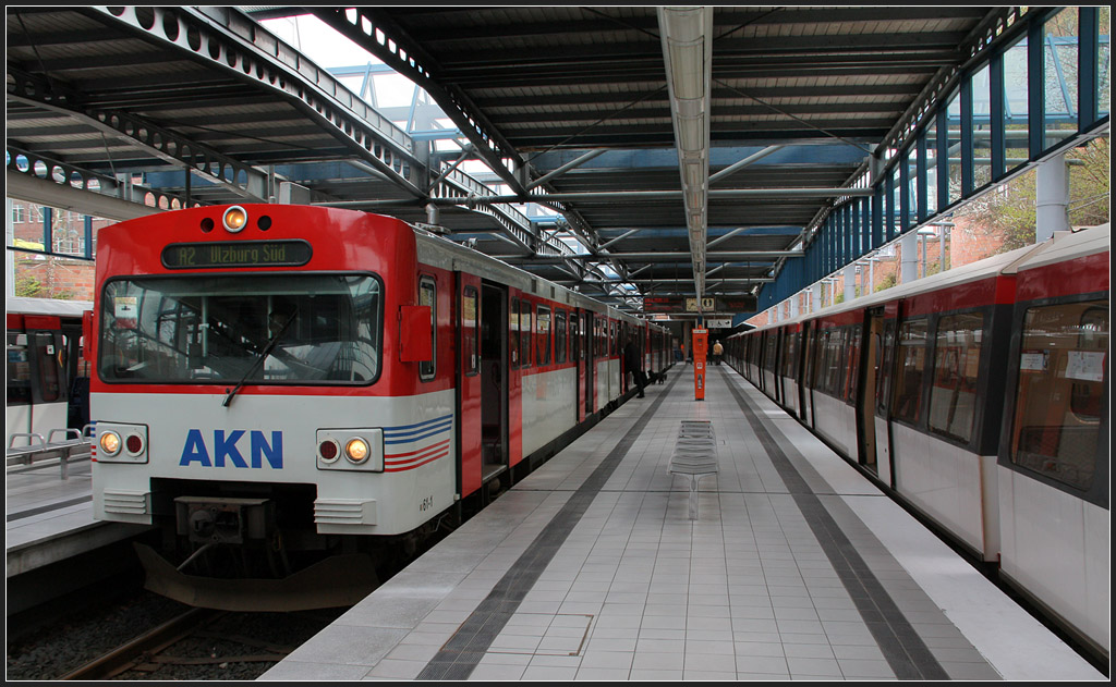 An der Station "Norderstedt Mitte" kann von der Hamburger U-Bahnlinie 1 am selben Bahnsteig in die Vorortbahn der AKN umgestiegen werden. Dies hält auf dem Mittelgleis der dreigleisigen Station. Von Süden her endet hier die U1, von Norden her die Linie A2.