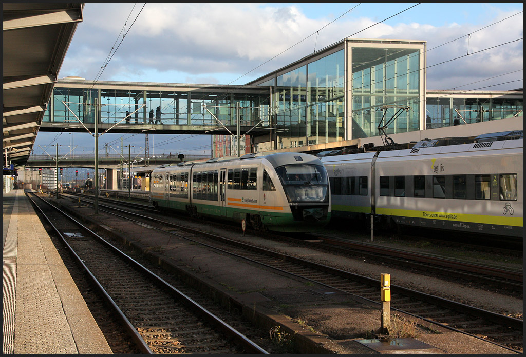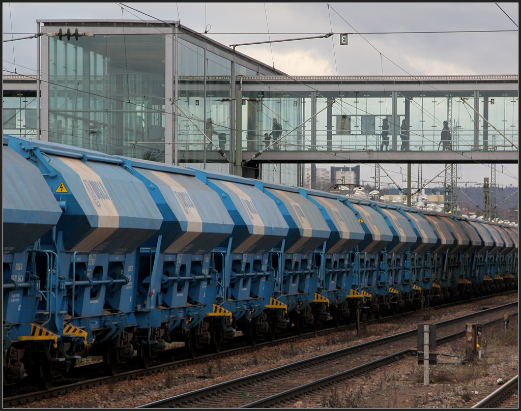 Farblich harmonische Zusammenspiel der Züge und der modernen Bahnsteigbrücke.